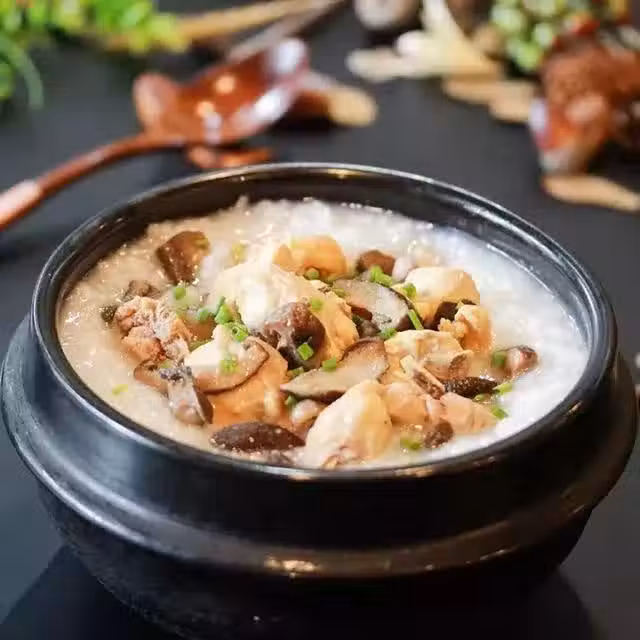 大米100克、雞肉300克、干香菇15克、油菜苔4棵、食鹽2克、白鬍椒粉2克、生粉15克、花生油10毫升、水適量、薑片1片