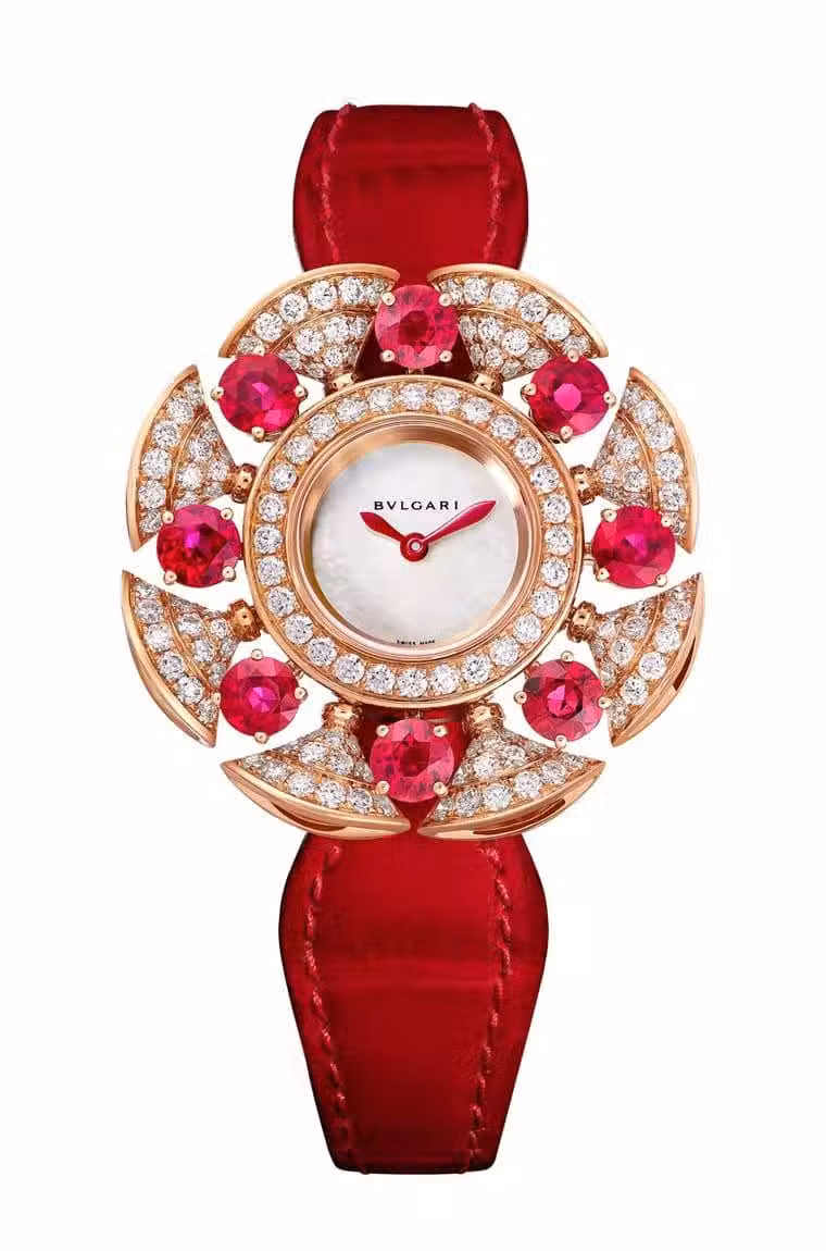 玫瑰金材質/石英機芯/時、分顯示/錶款鑲鑽81顆、紅寶石8顆/藍寶石水晶鏡面/防水30米/錶徑33mm