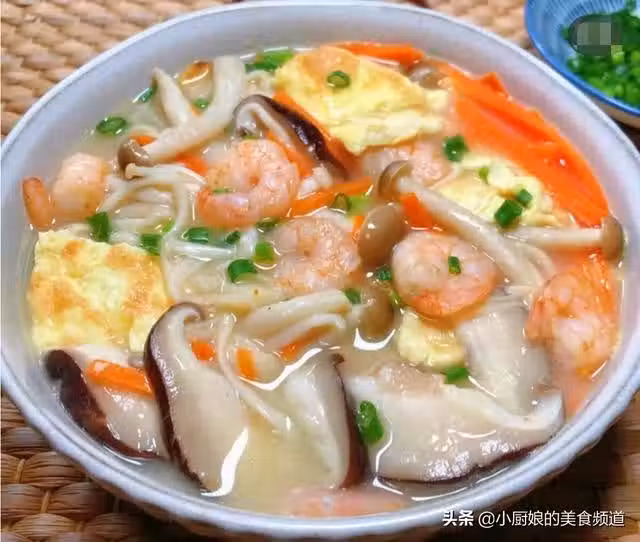 金針菇、香菇、蟹味菇適量、胡蘿蔔半個、雞蛋1個、蝦仁10個、蔥末少許、鹽少許