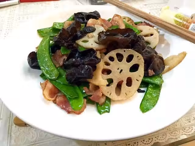 荷蘭豆;木耳;藕片;生抽;大蒜;培根