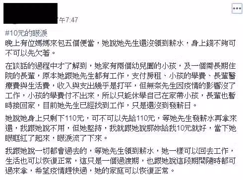 帖子一經發布,立即獲得了11000個贊,並觸動了評論:「看完我的眼睛都紅了!」、「好溫暖的故事,謝謝你的好意!」、「我感觸頗多,快3個月沒有工作了,我感受到了,社會處處有溫暖!」