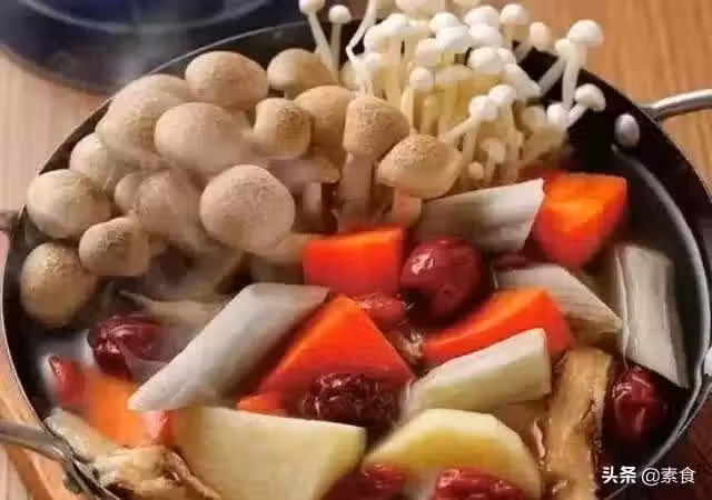2.將山藥、牛蒡及胡蘿蔔放入湯鍋,加入當歸、枸杞、紅棗、薑片及素高湯煮開。