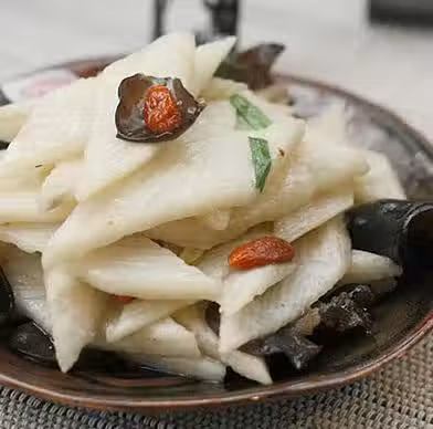 3在鍋中倒入油,放入薑絲爆香後先放入山藥翻炒兩三分鐘,然後放入木耳,倒入用黃酒泡過的枸杞。黃酒也一同倒入。翻炒兩分鐘。倒入香蔥、調入鹽和雞精翻炒均用後出鍋盛盤。