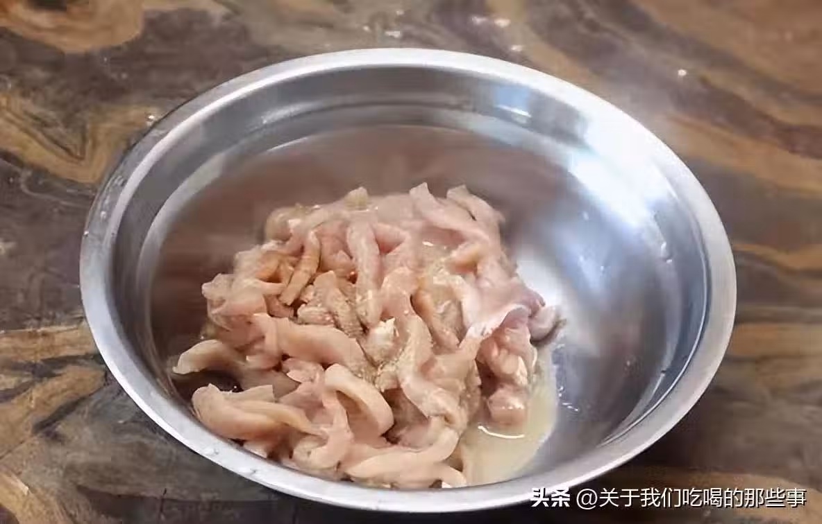 7、解凍好的肉就可以進行烹飪了,可以做蒸肉,也可以做炒肉。炒肉想要口感滑嫩,還需要腌制一下,用食鹽、生抽、蛋清、澱粉、食用油這5樣抓勻,怎麼炒都滑嫩。