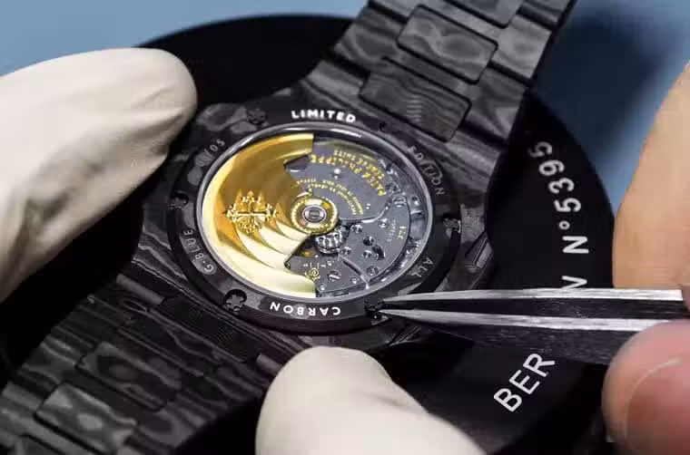 翻至表背,會讓人有真相大白之感,Nautilus 5711 The Black Grail的表殼,包括透明底蓋邊緣其實都還是鍍黑的不鏽鋼,但是Nautilus 5711 The Black Grail G-Blue是連表殼以及鏈帶的中央錬節處等部分都是碳纖維製成的,這點從表耳、底蓋邊緣的碳纖維紋路可見一斑,因此兩款黑聖杯金鷹5711的重量差異主要發生在表殼零件的材質不同,所以G-Blue其實不僅是面盤顏色改變,包括表殼材質也有細節進化,讓手錶戴起來更輕盈舒適。這款Nautilus 5711 The Black Grail G-Blue限量5隻,要價179,990歐元,不愧是聖杯等級的改表,要價自然也不同凡響。