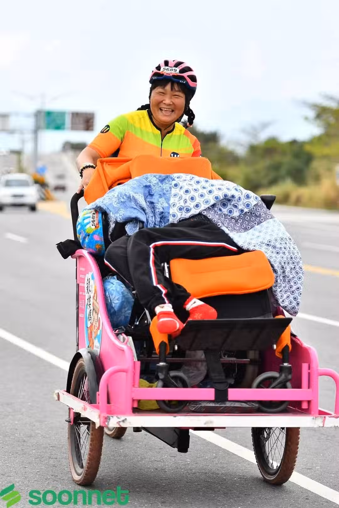 極重度腦性麻痺,讓她悲痛欲絕。5年前,陳嘉齡開始投身馬拉松賽事,與小比一同跑遍全台,並將過程、心得分享在臉書粉專「小比的跑旅雜記」。如今,母子倆又完成首場三項鐵人賽事,讓許多網友為之動容,讚嘆母愛的偉大。