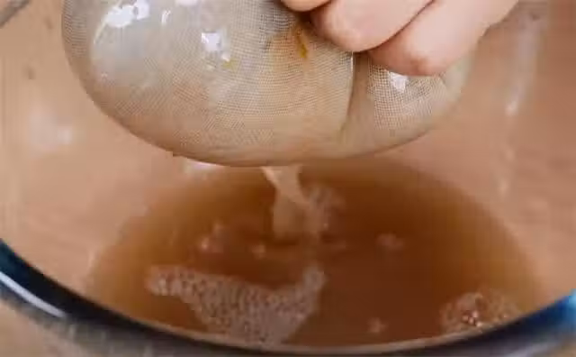 7.這時候再準備一塊紗布,把梨汁過濾出來。8.倒完梨汁之後開大火煮開,一直煮到這樣沸騰的狀態,我們轉小火慢慢熬。