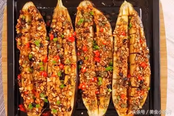 7、把肉末平鋪在烤過的茄子上,鋪均勻,放入烤箱再次烤