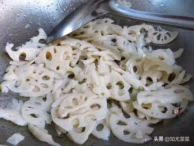 4、重新洗乾淨炒鍋,熱鍋涼油,油溫熱七八成熱之後,倒入蓮藕片。