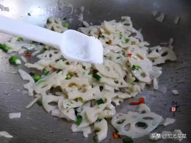6、最後加小半勺食鹽提味即可,炒蓮藕不建議大家添加其他過多的雞精粉或者胡椒粉等調料,會影響藕片原先的清甜味。