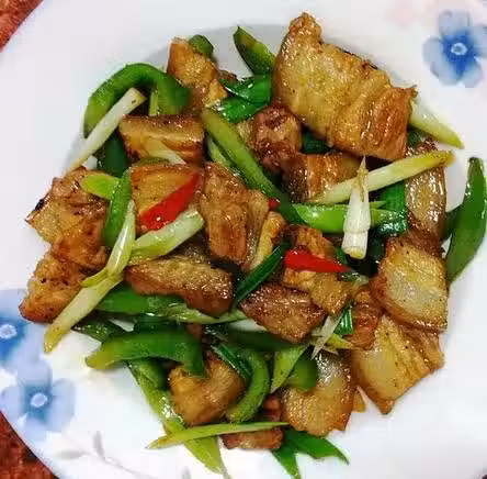食材:五花肉(三層肉)、青椒、紅辣椒、青蒜、蒜頭、鹽、味精
