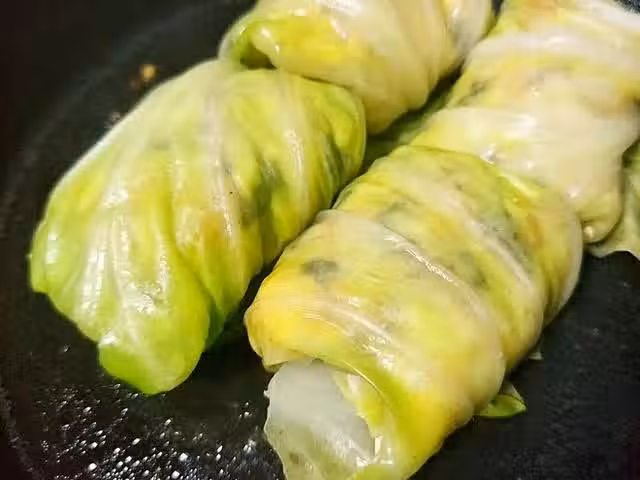 用包菜葉子吧洗料卷進去,平鋪在刷了油的塔吉鍋里。澆上一小勺,用蚝油和水調的汁。中火三分鐘,小火三分鐘,燜三分鐘即可