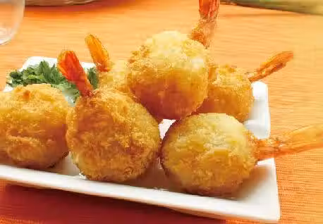 7))鍋里放油,燒到六成熱就把蝦球放進去炸,不斷地翻面,炸到外表金黃就可以撈出來了。