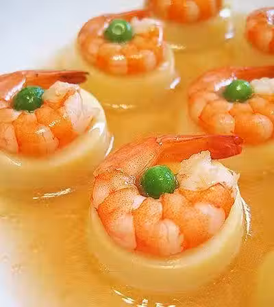 3)把切好的日本豆腐均勻擺入盤中,豆腐表面各擺放一隻蝦仁