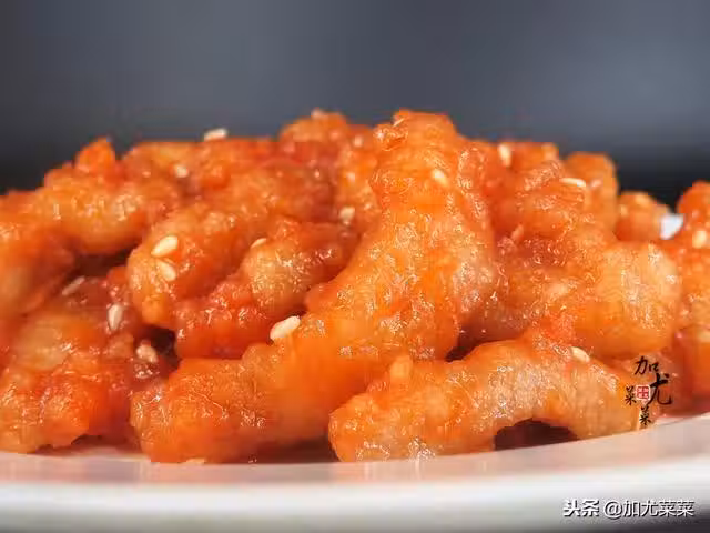 5、開小火,慢慢攪拌讓白糖融化,看到西紅柿汁濃稠就關火。最後趁熱倒入裡脊肉,撒上一小搓白芝麻,攪拌幾下即可裝盤出鍋。