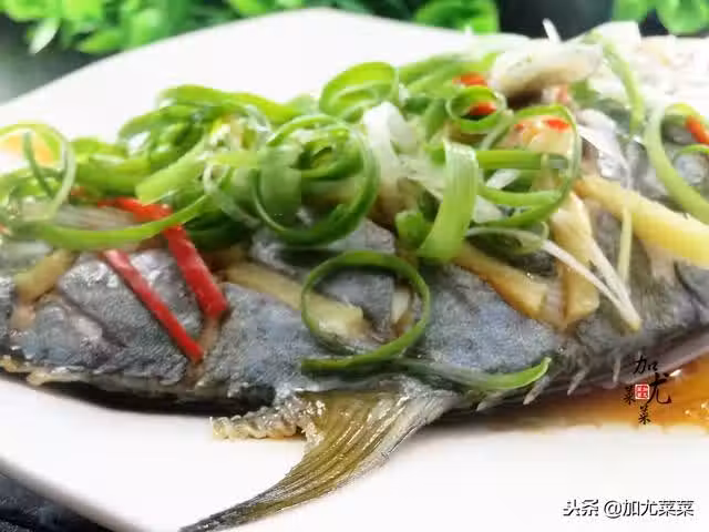 4、魚出鍋後倒掉盤底的水,魚身放上薑絲,蔥絲,和辣椒絲,鍋里燒點熱油,澆淋在金鯧魚上面,最後再倒入幾點醬油即可上桌。