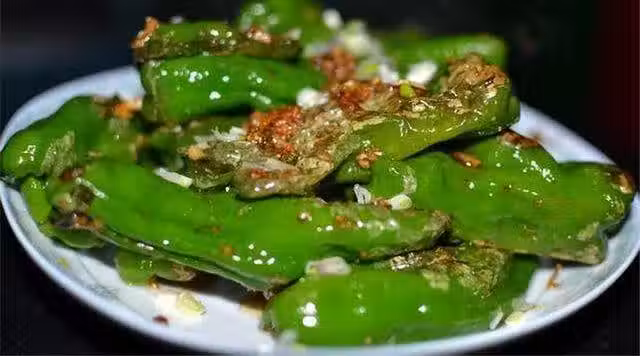 3.在鍋中放入適量的油,加入蒜片和豆豉醬,慢慢地煸炒出香味來然後放入虎皮辣椒一起翻炒幾下,再加入少量的水稍微煮一下最後加入白糖、鹽等調味,翻炒幾下即可