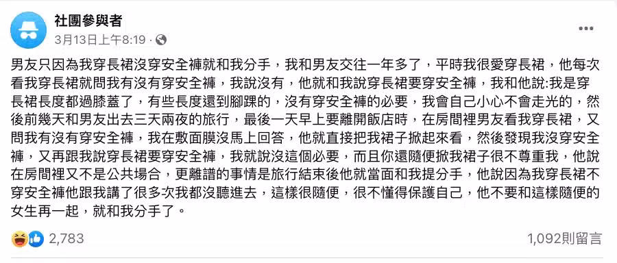 文章曝光後,底下許多網友紛紛表示:「恭喜你分手了」、「控制欲那麼重,也太恐怖」、「恭喜妳離開控制狂」、「穿長裙還穿安全褲,是什麼鬼」、「妳遇到古代人嗎」等回應,大家都覺得男友的行為實在太誇張了,慶幸原PO早點看清離開~