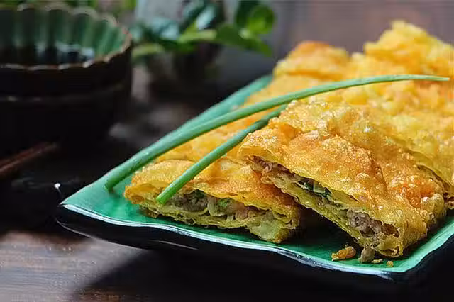 2張豆皮,1塊豬肉,微微炸制,出鍋「餅」香酥嫩,勝過一切早餐