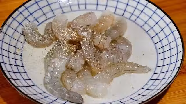 2、 在蝦仁中加入少許鹽、白鬍椒碎、料酒、薑汁,用手抓勻,腌制一下。