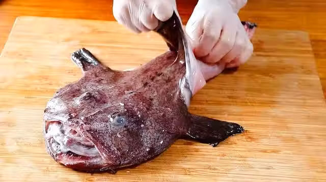 1、 鮟鱇魚取出內臟清洗乾淨,撕掉最外面的魚皮,把魚頭和魚身切斷開。(魚頭這道菜用不上,可以另外拿來燉湯)