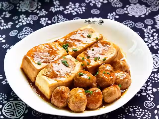 4、肉餡釀在豆腐里。剩餘的肉餡加入紅薯澱粉攪拌,搓圓做成豆腐丸子。