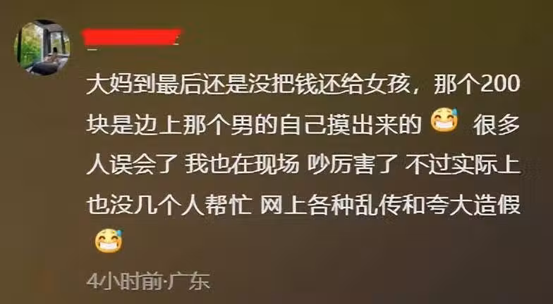 當地媒體表示:「這位撿錢拒絕歸還的老太太,在熱心大哥的耐心勸說下,才不情願地將錢還給女學生。」但有幾位現場目擊者表示,老太太根本就沒有把錢還給女學生,那200元是大哥自掏腰包拿出來的。