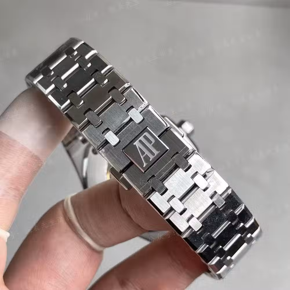 腕錶搭載一條佩戴舒適度以及極具優雅姿態的精鋼錶鏈,搭配AP字樣折疊表扣。整體經過細緻打磨,非常貼手,佩戴起來極其舒適。