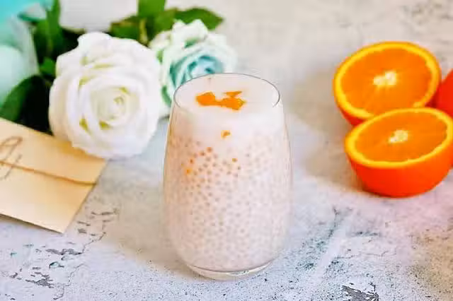 做法步驟:椰漿、水、砂糖倒入鍋里一起燒開後晾涼備用。鍋里加足水,水開後緩緩倒入西米,邊倒邊攪。煮好後燜10-15分鐘,燜至西米沒有白芯,濾出水,沖洗後濾干。把濾好的西米倒入煮好的椰漿里,裝入杯中,加入甜橙粒即可。