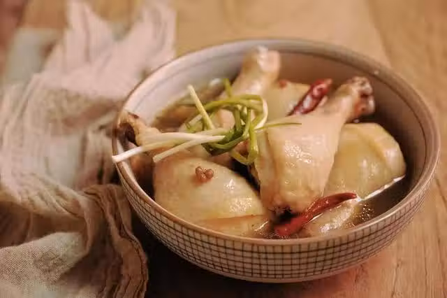 雞腿5-6隻;鹽1.5小勺;花椒7-8粒;薑片3,4片;蔥結1個;料酒2大勺;干辣椒2根
