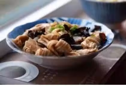 1、豆腐結用熱水泡一下,黑木耳提前泡發。