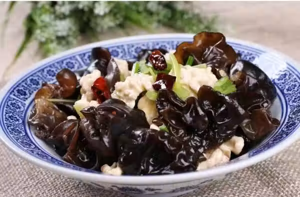 食材:核桃仁,木耳,芝麻,橄欖油,白醋,白糖,鹽和香菇精。