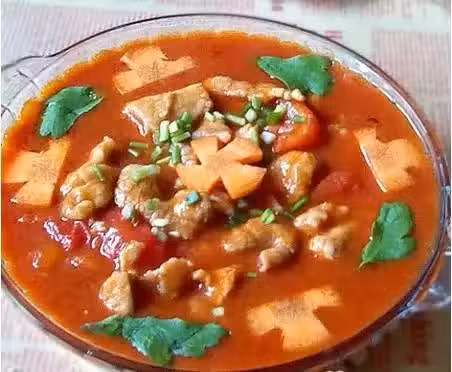 食材:番茄200g、裡脊肉200g、鹽適量、薑適量、蔥花適量