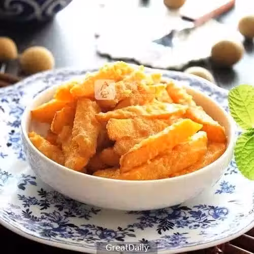 3、炸至油溫不宜過低,油溫過低南瓜條就會吸入大量油,口感不好!
