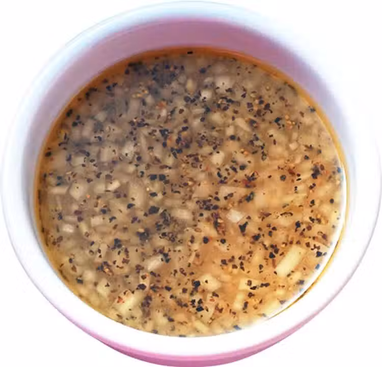 洋蔥碎1大匙,橄欖油2大匙,白酒醋2大匙,黑胡椒粒1小匙,鹽1/2小匙,糖1小匙,檸檬汁少許