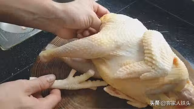 第二步:雞涼干水分後,把雞爪和雞頭砍掉,愛吃雞爪的可以把雞爪塞雞肚子裡,雞頭就不要了,如果喜歡吃咸一點的雞,可以先用少許食用鹽抹一下雞身,我們做鹽焗雞都是不用抹鹽的,但有很多朋友說現做現吃的不夠入味,所以就會選擇抹少許鹽。