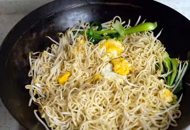 加入之前調好的醬汁,然後將炒麵炒勻,讓炒麵都均勻上色。