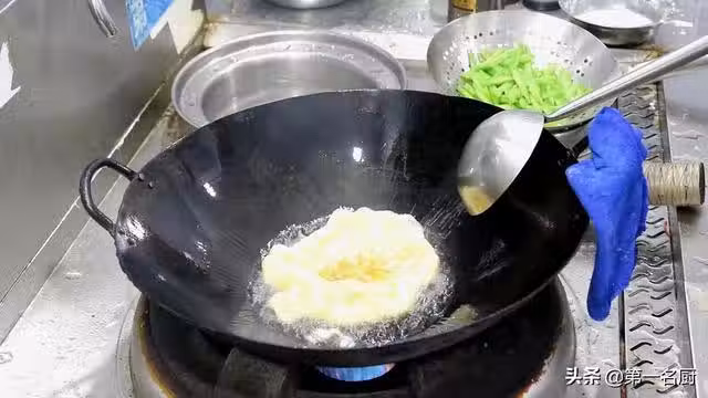 5.鍋內再添入少許食用油,倒入蔥花和紅椒爆香,再倒入苦瓜,開小火翻炒幾下,開始調味:加入食鹽1克,上火繼續翻炒,再倒入雞蛋,翻炒10秒鐘,淋入少許香油,簡單翻勻,美味即成。