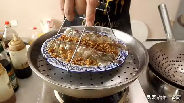 6.時間到了關火,取出蒸好的粉絲大蝦,撒上適量的蔥花,澆上200度的熱油激發出香味,最後澆上蒸魚豉油,美味即成。