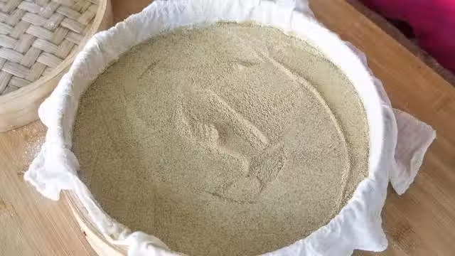 5、這個是干桂花和細砂糖一起混合研磨成的粉末,因為家裡沒有研磨機,我是直接買的磨好了的,這個餡兒是桂花原味,稍微的有一點點苦澀;