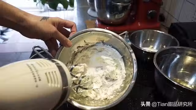 5、將液體分三次加入到乳酪中,加入一次攪拌均勻了,再加下一次。直到所有的液體添加完畢。