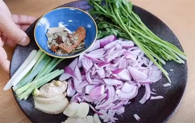 2.這個是做調味油的材料,準備一些香菜、洋蔥,大蒜、薑片、蔥花,再放一些大料,這樣炸出來更香。