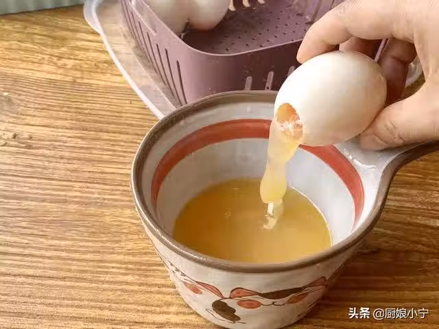 2,選擇生的鹹鴨蛋,先洗去外面的泥,然後用剪刀在小頭的部分,輕輕磕幾下,剪出一個一角硬幣大小的洞,將其中的蛋清倒出來,留下蛋黃,用清水裡面都清洗乾淨,避免有殘留的蛋清。倒扣在濾網上,控掉水分和蛋清備用。