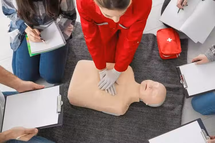 3. 進行胸外按壓,讓患者平躺在平坦而堅實的平面上,施救者兩周交叉緊扣,掌根放在兩乳頭連續的中點,肘部不能彎曲,快速用力向下壓5~6厘米以每分鐘100~120次的頻率進行勻速按壓。