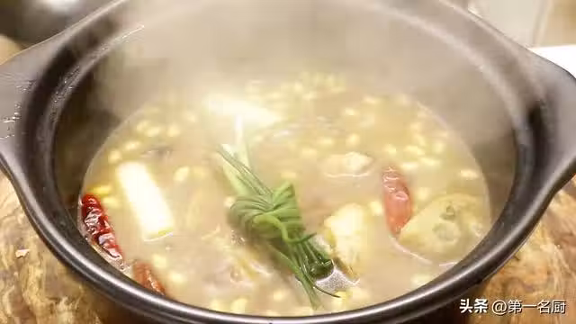 5,準備一口砂鍋,連湯帶豬蹄一起倒入砂鍋內,放入幾根小蔥,熬制一個小時。