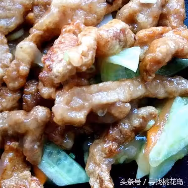 11. 先倒入炸好的肉段,再沿鍋邊倒入調好的碗汁,急火快速翻炒,使肉段均勻掛上透明的芡汁,關火出鍋即可。一定要急火快炒,芡汁一變粘稠,馬上出鍋。不然肉段外面脆脆的口感,會被芡汁泡軟,那樣就不好吃了。