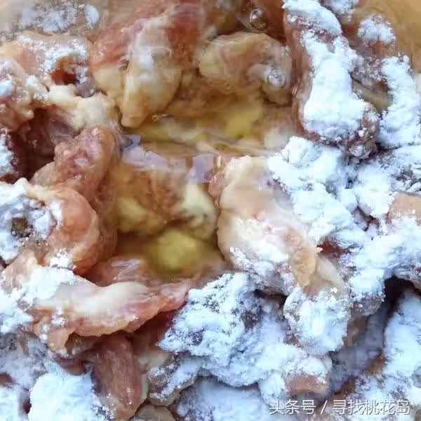 4. 肉腌好之後,加入蛋清和澱粉,抓勻。麵糊不要調得太稀,濃度以裹住肉條即可。我只用了澱粉,也可以在澱粉里加少許麵粉,這樣糊會稍厚一些。