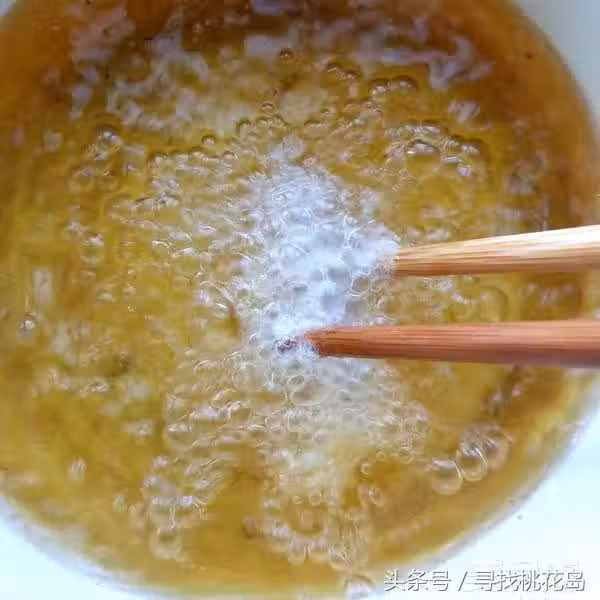 5. 鍋中倒入植物油,油溫燒到五成熱左右,將肉條放入炸至定型。因為家裡做的話,為了節省用油,一般都用小鍋,少量油,所以不要一次把肉條投入太多,以免粘在一起。放入油中後要及時撥開。判斷油溫的方法:把木筷子的頭插入加熱的油中,筷子頭冒出細小密集的氣泡,差不多是四五成熱。如果是用電磁爐控溫,五成熱差不多是150度左右。也可以用筷子先夾一條肉,放入油中,如果立刻浮起,說明油溫合適,如果沉底了,說明油溫不夠,還得再加熱升溫才行。