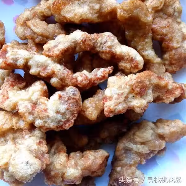 8. 第二次復炸的時候,把肉炸至熟透,在油溫六七成熱時下肉條,一下多倒入一些,炸到顏色變成金黃,邊緣少許金橘色,立刻用漏勺撈出,瀝淨餘油備用。此時一定要注意火候,不要炸糊了。