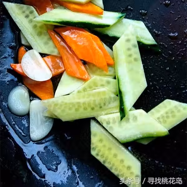 10. 在炒鍋中倒入適量油,燒熱後倒入蒜片爆香,將胡蘿蔔片和黃瓜片炒至斷生。注意保留黃瓜和胡蘿蔔脆脆的口感,不要炒過了。